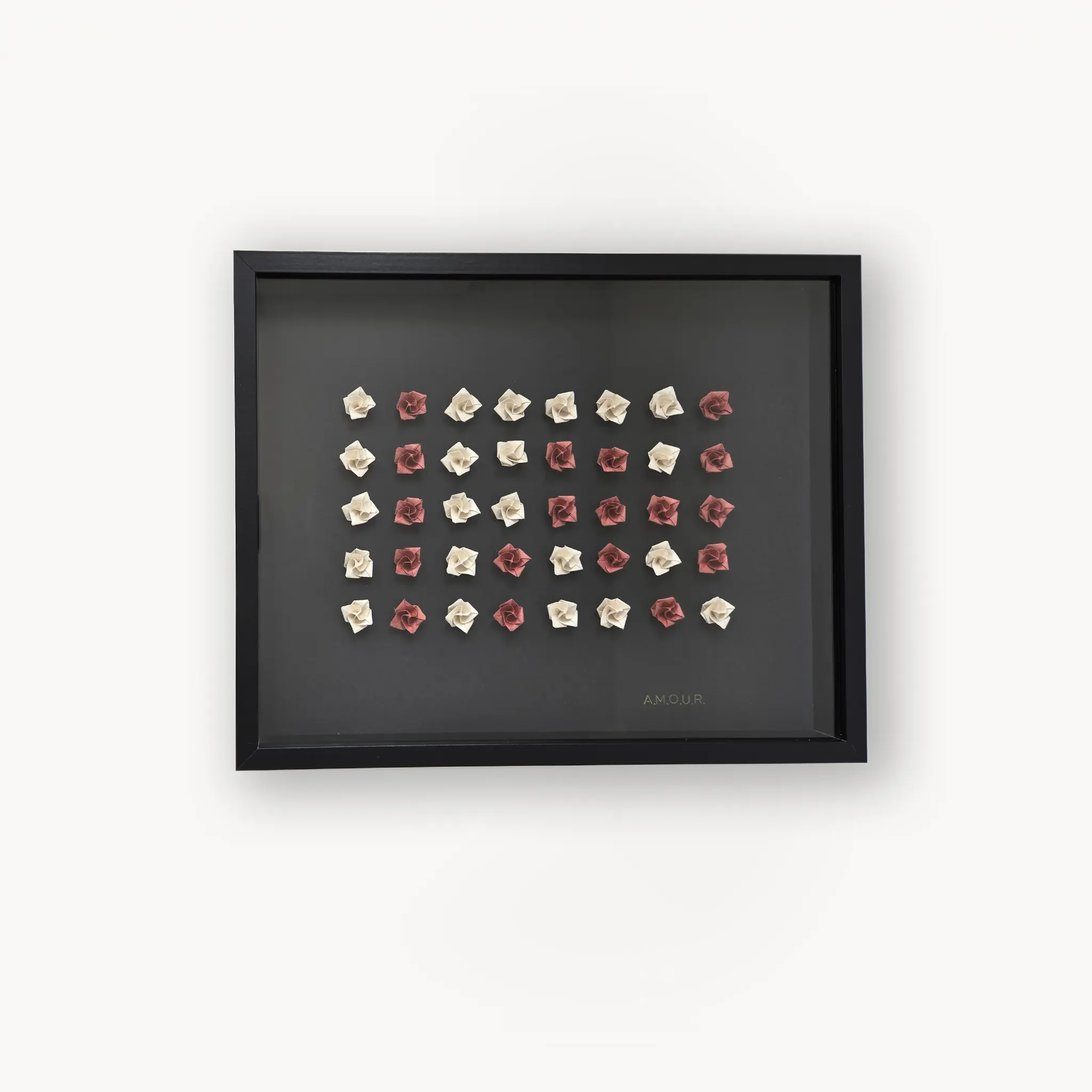 Le tableau “AMOUR” fait partie de la série artistique "Les Binaires", une collection qui explore la rencontre entre le langage numérique et l’artisanat d’art. Chaque œuvre repose sur ce concept simple et fort : écrire un mot en langage binaire, où le 0 et le 1 sont représenté par une couleur. Ici, le 0 est représenté par une rose en papier blanc et le 1 par une rose en papier coloré. Dans ce tableau, le mot AMOUR est ainsi encodé visuellement à travers une composition rigoureuse et harmonieuse de 40 roses en origami. Les roses sont réalisées en papier népalais, un papier artisanal reconnu pour sa texture et sa résistance, puis pliées entièrement à la main selon la technique traditionnelle de l’origami. Présenté dans un cadre noir élégant, ce tableau joue sur le contraste entre la rigueur du code binaire et la douceur du papier, entre la technologie et l’émotion. Une œuvre idéale pour apporter une touche contemporaine, poétique et conceptuelle à un intérieur. Caractéristiques Titre : AMOUR Série : Les Binaires Technique : Origami – pliage à la main Matériau : Papier népalais artisanal Dimension 52 x 42 x 4,5 cm Couleurs : Blanc et Rose sur fond noir Encadrement : Cadre noir, prêt à être accroché Fabrication : 100 % fait main Pièce unique